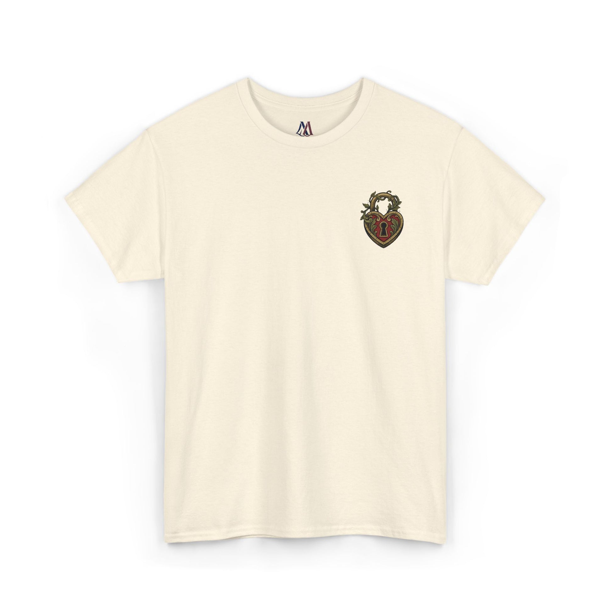 Crafted from soft, heavyweight cotton with a comfortable unisex fit, this shirt is built for all-day wear. The vintage-inspired heart padlock features ornate detailing with warm brown and burgundy tones, giving it an elegant, antique aesthetic that stands out without being overly bold.